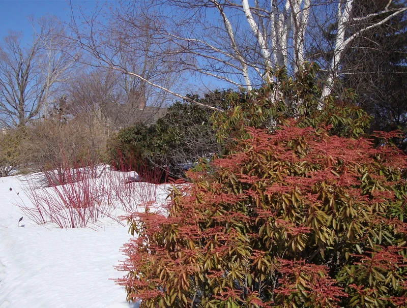 ome winter days are unrelentingly gray, and for these, small splashes of color are what is needed: colorful conifers, a mass of snowdrops, or the buds of the ‘Valley Valentine’ pieris pictured here.